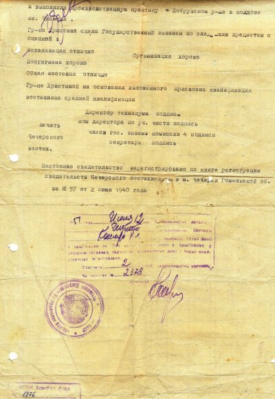 До юбилея музея осталось 14 дней. Экспонат №17 Свидетельство Чечерского зоотехникума выдано гражданке Христиной Анне Георгиевне в том, что она 30 июня 1940 г. окончила полный курс обучения.